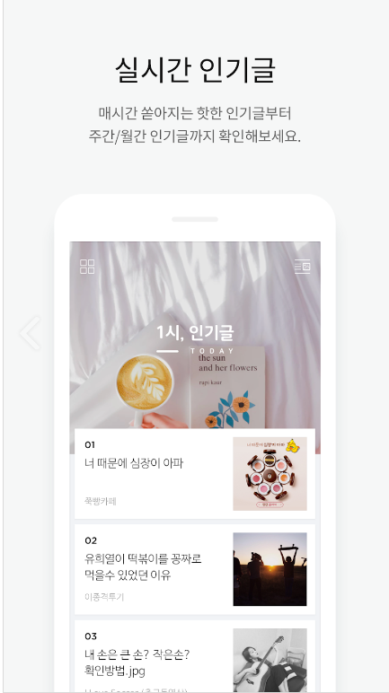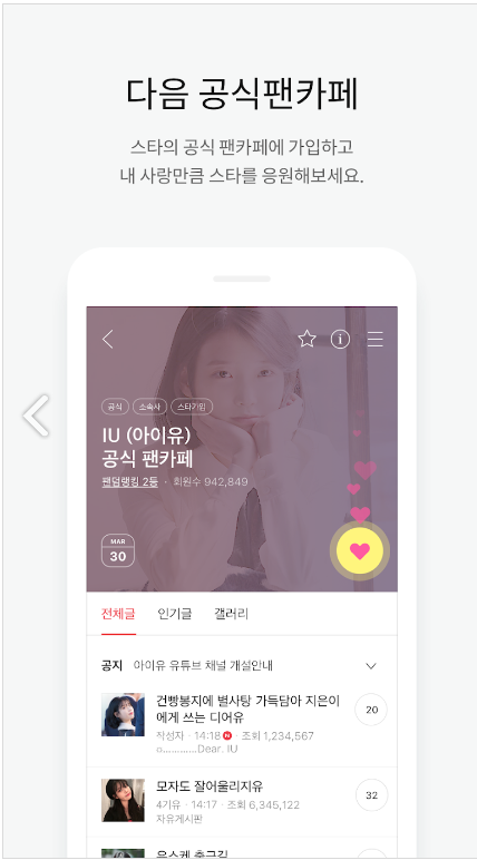 다음 카페 앱에는 공식팬카페도 있구요. 홈을 직접 꾸밀 수도 있고, 홈에서 즐겨찾는 카페나 게시판으로 바로 이동할 수도 있습니다. 이모티콘, 투표 등 다양한 아이템을 첨부하고 PC에서 작성한 글을 수정도 할 수 있습니다. 구독 기능을 통해 키워드, 핫플, 게시판, 친구 등을 구독하여 관심있는 컨텐츠를 손쉽게 받아볼 수 있습니다.